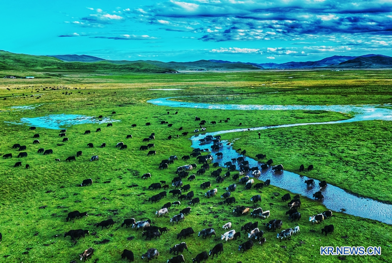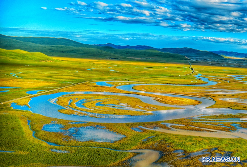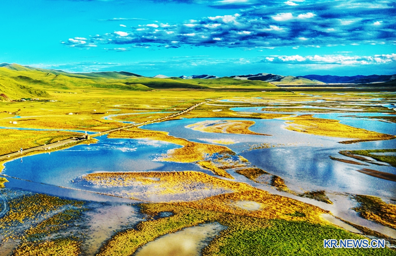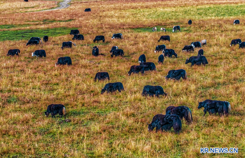 [신화망 베이징 9월11일] 초가을에 접어든 쓰촨성 아바짱족챵족자치주 아바(阿壩)현 만쩌탕(漫澤塘)습지대초원이 그림같은 풍경을 뽐내고 있다. 평균 해발이 약 3400m인 만쩌탕(漫澤塘)습지대초원은 촨시베이고원의 우량 목장이다.