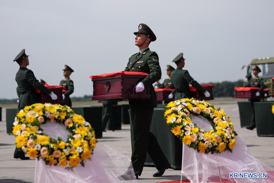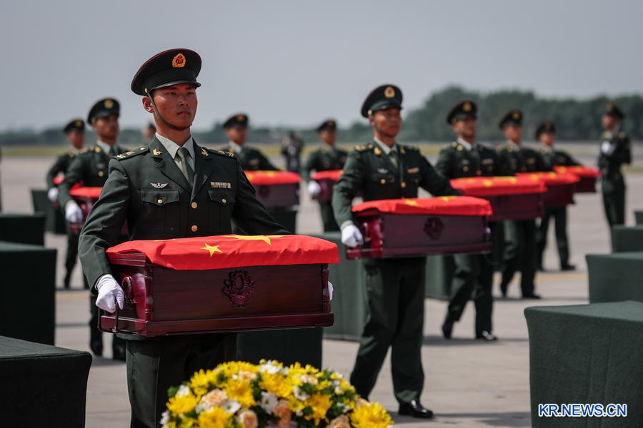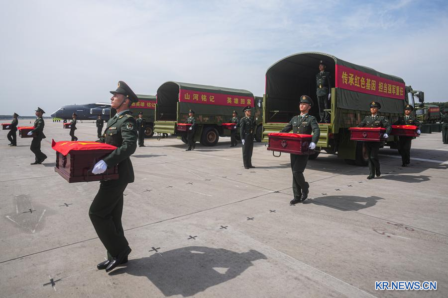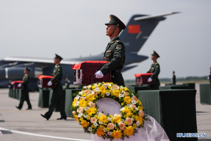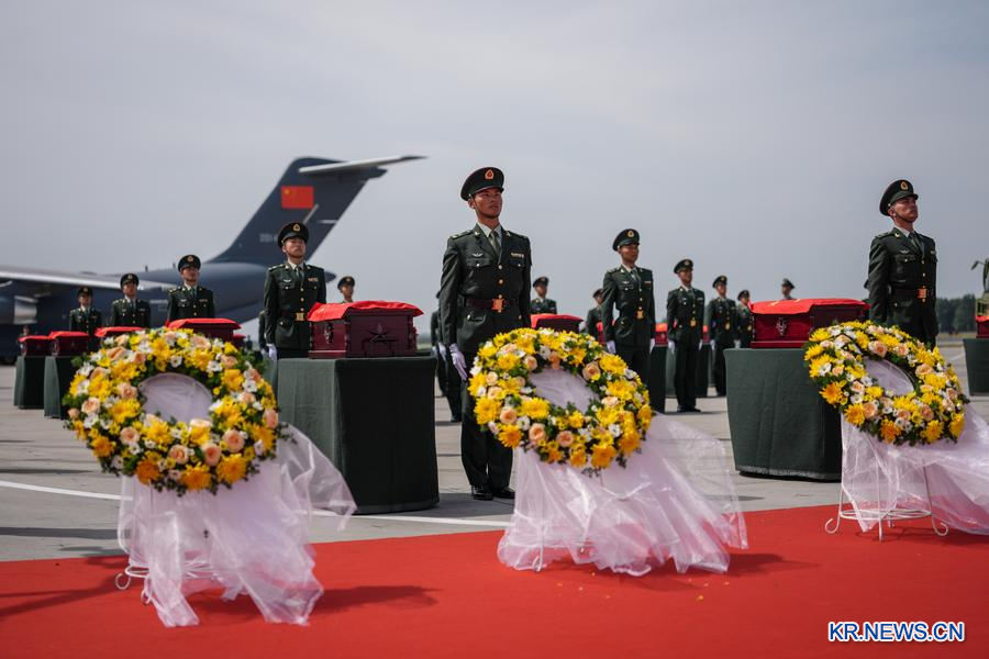 [신화망 선양 9월12일] 12일 오전 한국 측은 인천국제공항에서 제12차 재한 중국인민지원군 열사 유해 30구와 관련 유품 267점을 중국에 전달했다. 이어 이날 10시 57분경 지원군 열사 유해를 실은 중국 공군 전용기 '윈-20'이 랴오닝(遼寧)성 선양(瀋陽) 타오셴(桃仙)국제공항에 착륙했다. 이로써 열사는 조국의 품에 돌아왔다.