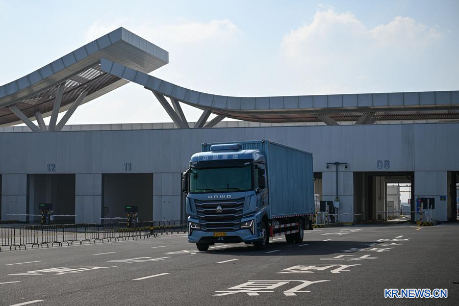18일 하이난(海南)성 하이커우(海口) 신하이(新海)항·난(南)항의 '이선(二線) 통상구(화물운송)' 집중 검사소에서 포착한 첫 번째 통관 화물 트럭. (사진/신화통신)