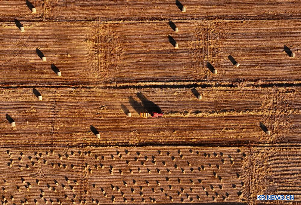 허베이(河北)성 탕산(唐山)시 펑난(豐南)구 논에서 볏짚 수거 업체 직원이 포장된 볏짚단을 트럭에 싣고 있는 모습을 27일 드론 사진에 담았다.