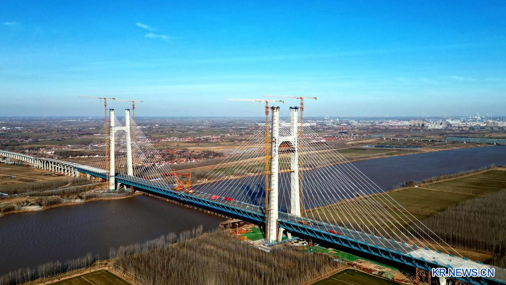 [신화망 둥잉 1월1일] 지난해 12월 31일 톈진(天津)시와 산둥(山東)성 웨이팡(濰坊)시를 잇는 진웨이(津濰)고속철도 둥잉황허(東營黃河) 도로∙철도 대교를 드론에 담았다.