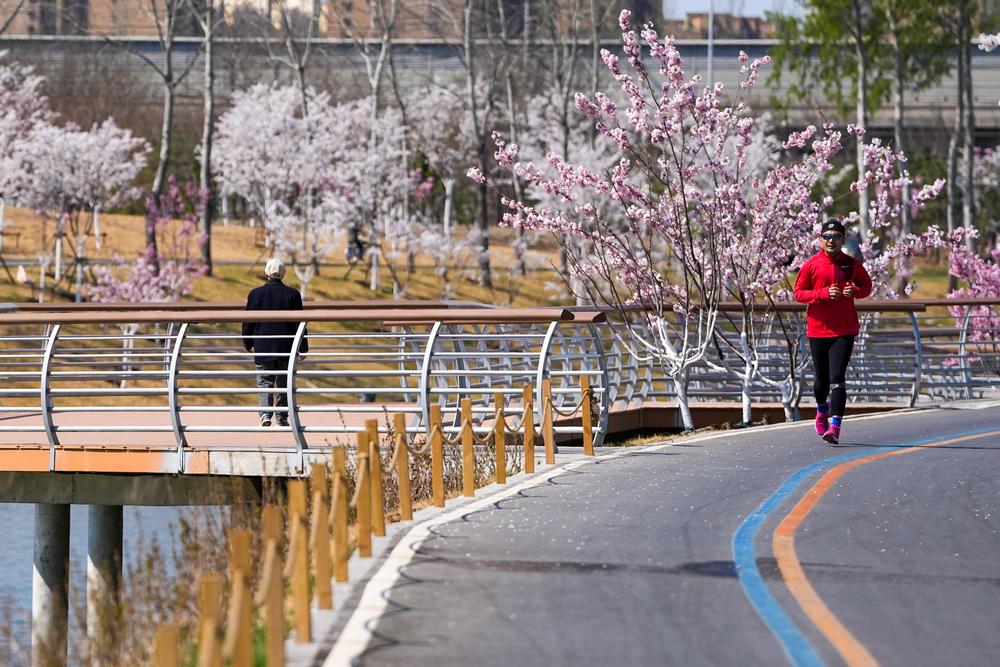 1일 베이징 강변을 찾은 시민이 활짝 핀 봄꽃을 배경으로 달리기를 하고 있다.