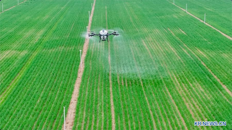 리화펑이 장비를 가볍게 누르자 식물보호 드론이 이륙해 푸른 밀밭 위를 낮게 비행하며 미세한 물안개 형태의 약제를 고르게 살포했다. 이 드론은 최신 레이더 시스템을 탑재해 한 번에 85㎏의 약제를 적재할 수 있고 작업 폭은 약 7.5m에 달하며 하루 평균 67~80ha를 처리할 수 있다.